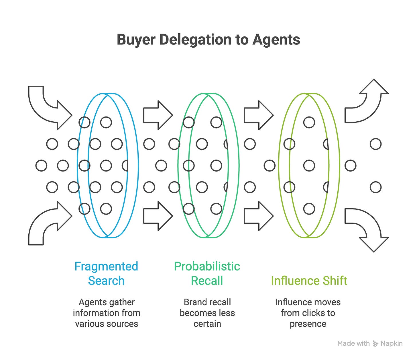 Agentic search collapses exploration, synthesis, and comparison into short, asynchronous bursts. Buyers no longer “move down funnels” in the traditional sense, they dip in and out of evaluation states, often across devices, environments, and moments that never touch your website. For all the belief that LLM and AI will collapse sales cycles, this has been the one output of the new system which we have not yet seen. These evaluations are still long, still convoluted and still take multiple offices, many, many months to reach a consensus.
