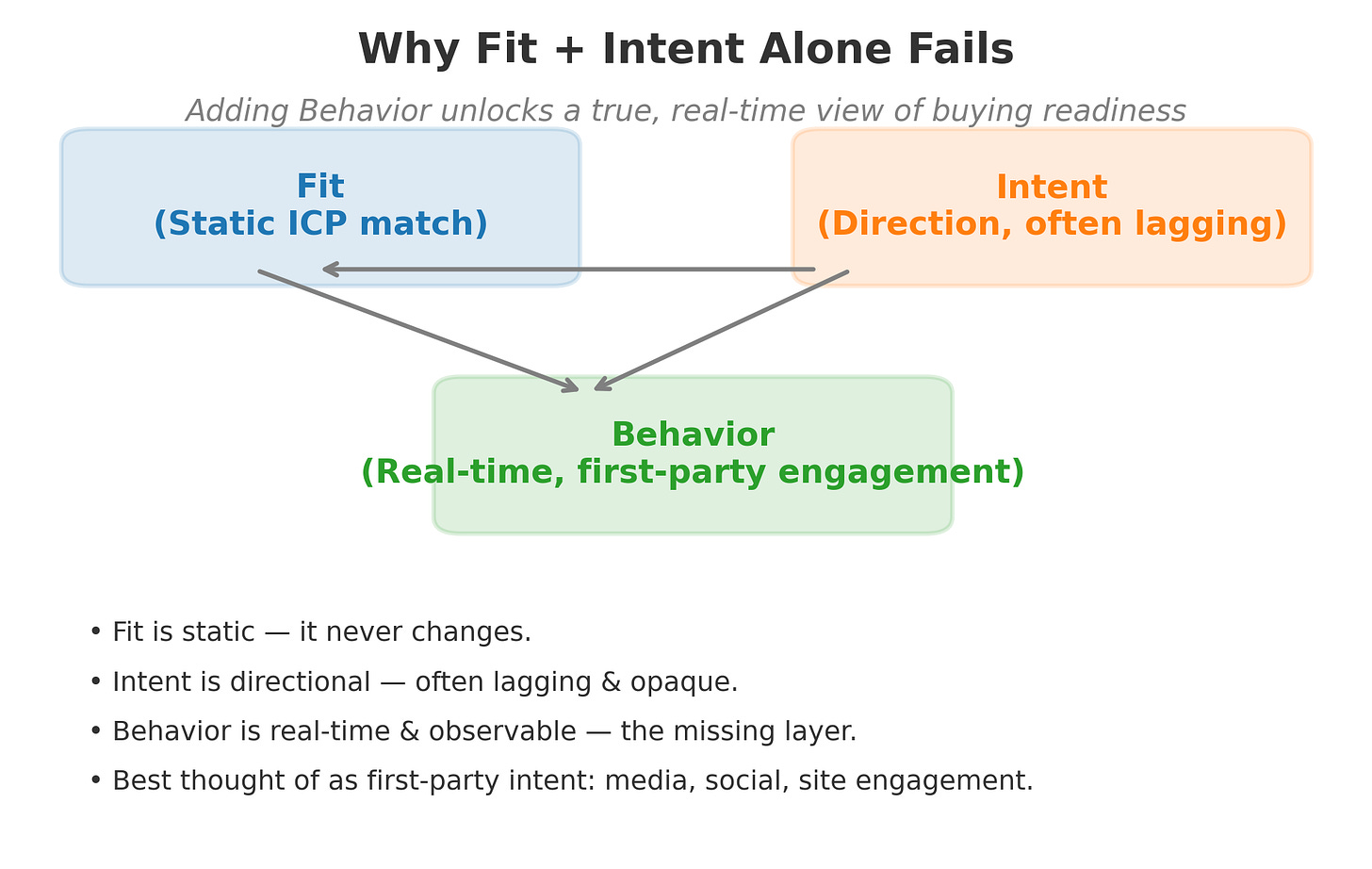 The missing layer? Behavior — real, observable engagement signals that track how an account interacts with you right now. I often see these as first party intent - the most valuable signals in many ways. These signals span media you buy, realtime interactions with your brand across the web (social etc) and on your owned website properties