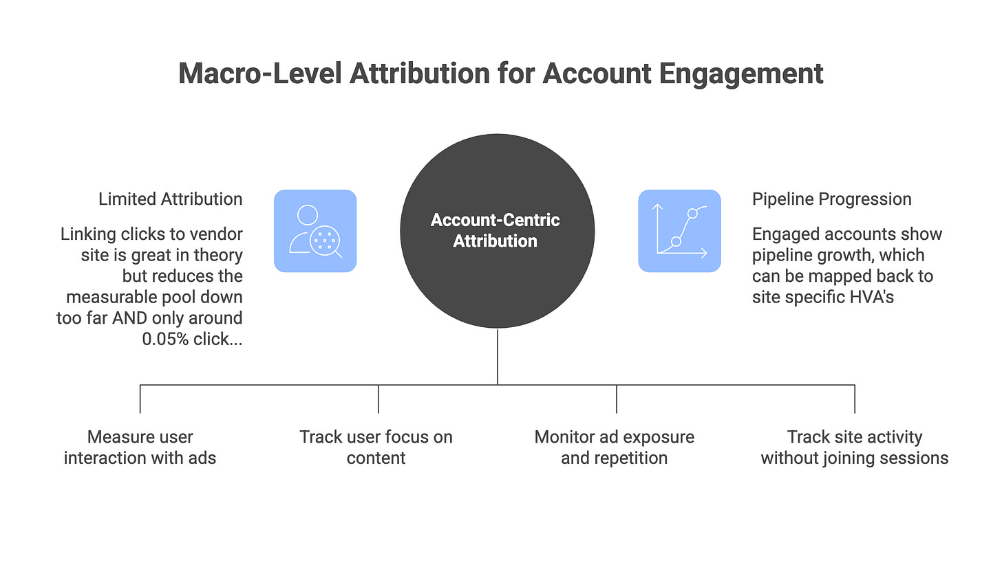 So then we ended up trying to link the minority of users who click, to the even smaller number that land on the vendor site, to the minor number of HVA’s exhaust fumes, right when post impression tracking died with cookies and the chance to link impression to session went with it. This is close but no cigar. The real win is thinking more about accounts engaged with ads - engagement scoring, attention metrics, reach, frequency value scoring etc and then monitoring the account behaviours on site and anywhere else they can be monitored - WITHOUT trying to join the sessions. The join is the misnomer where we push too deep into attribution; what matters is - on a bigger macro scale, do the accounts we engage with the messages we’re using start to show pipeline progression? if yes, tick the attribution box because to be honest, it won’t get better then that