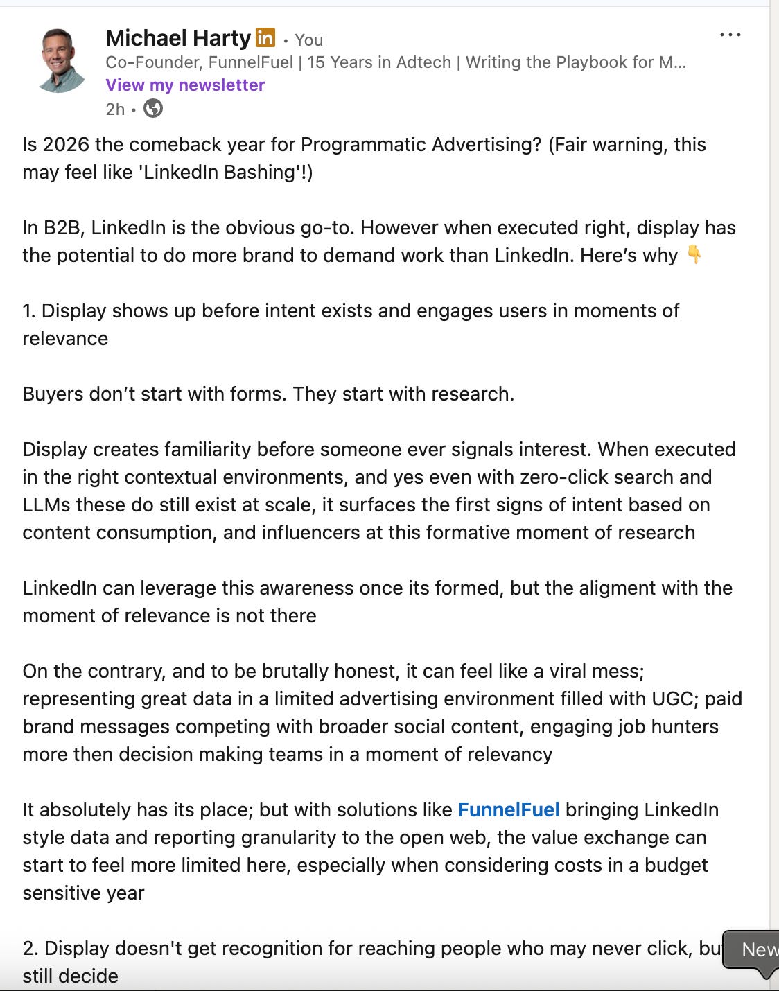 In a world where search was already going quiet, LinkedIn felt safe. It’s a topic I covered on LinkedIn below - click the picture to see the full post - which looks at LinkedIn versus display. When LinkedIn was the only show in town that brought the ABM targeting and reporting layer, it made a tonne of sense. Now that is very much doable in display, and display gives you the critical extra signal of environment (context that the reader was reading about) AND it does it cheaper… the pendulum has more than swung and its why leading vendors are redirecting their spend to channels like display that bring best in class signal insights back