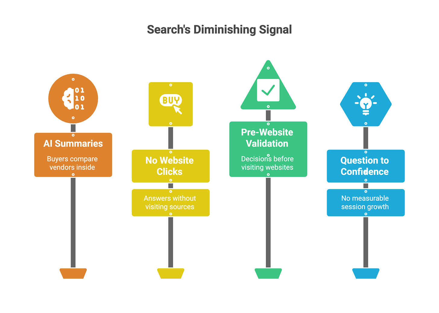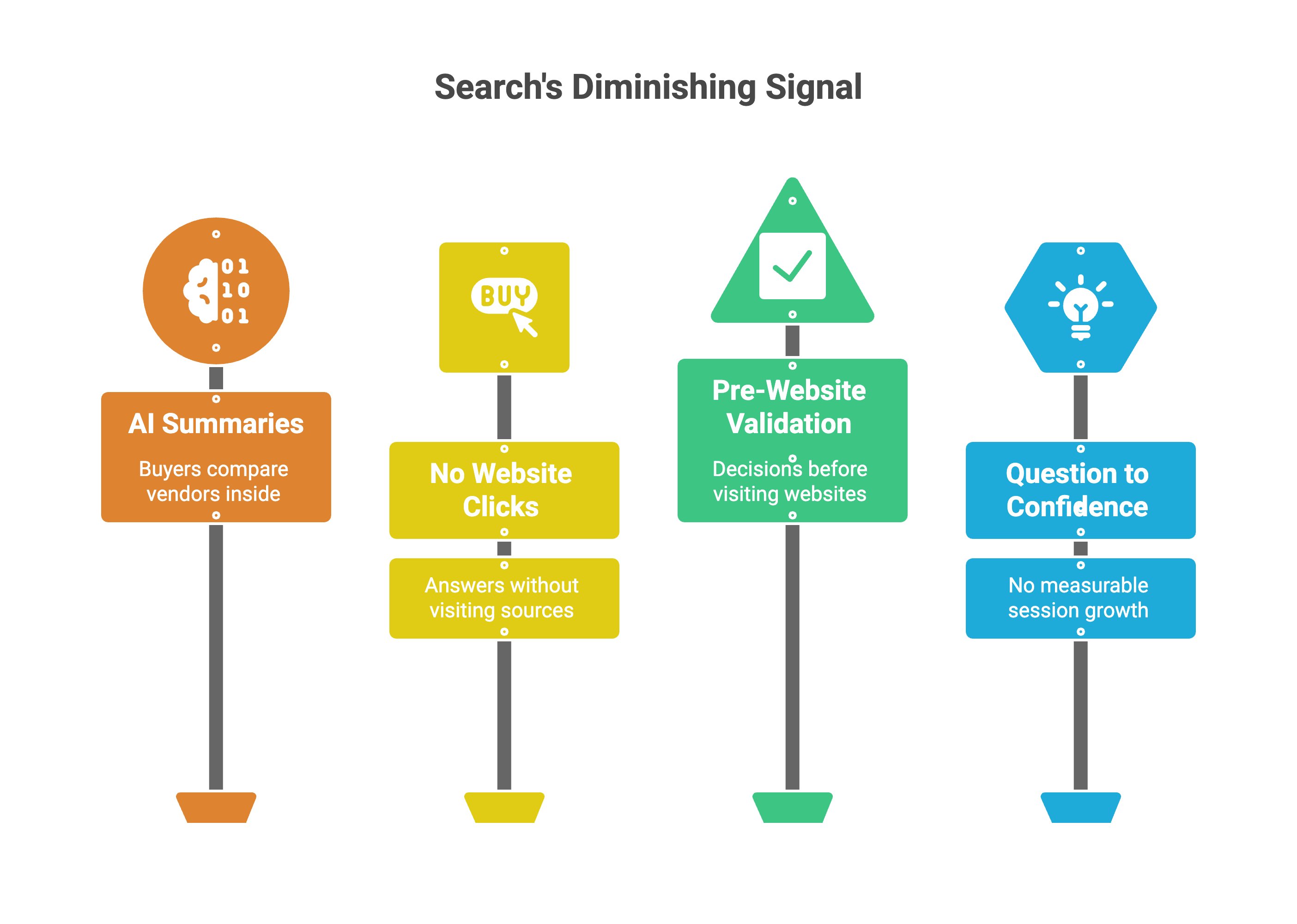 Whilst that happened, the buyer journey completely changed. AI answers. Zero-click journeys. Aggregated intent. Private research loops, from industry Slack channels to private Whatsapp groups.