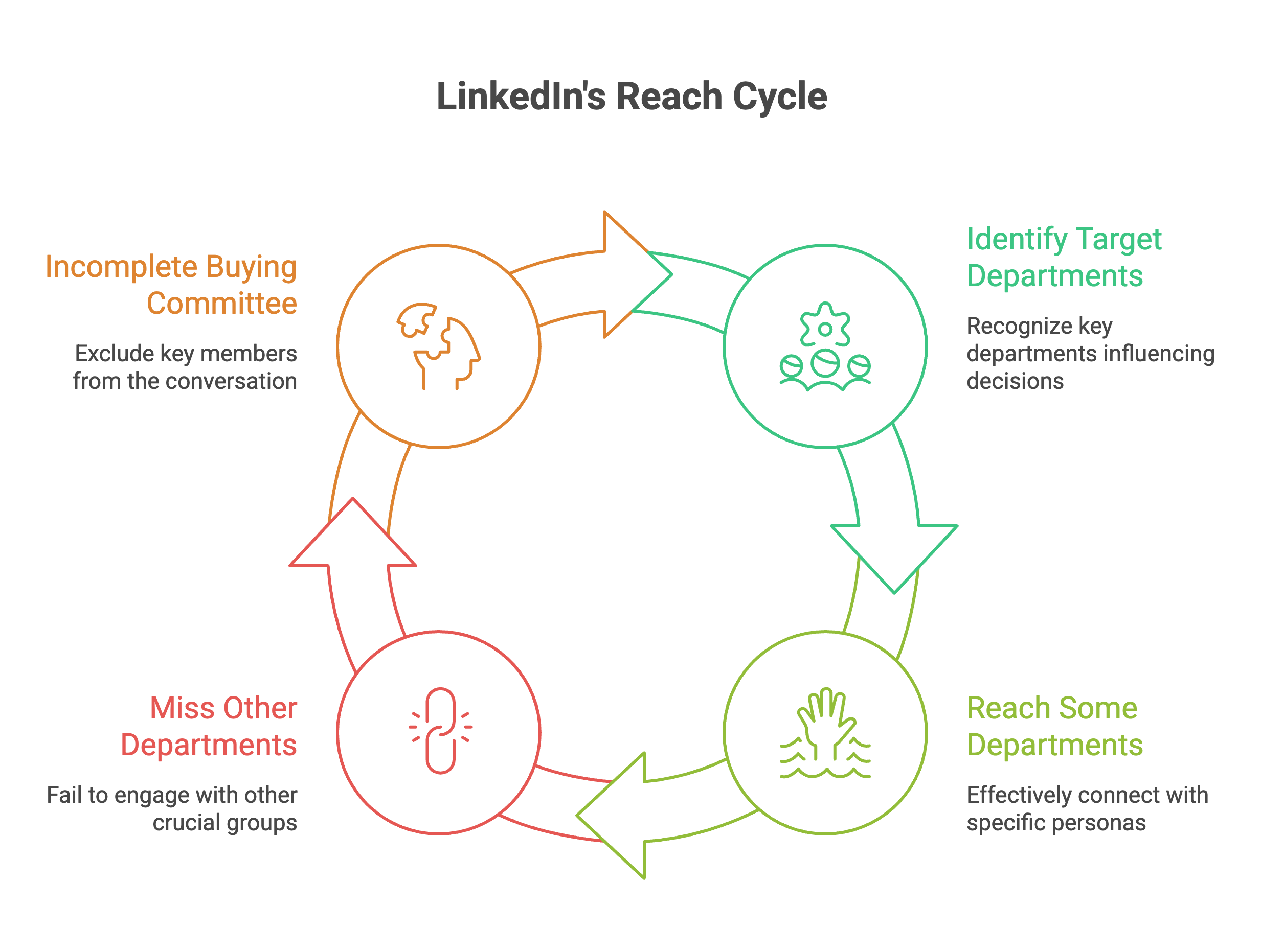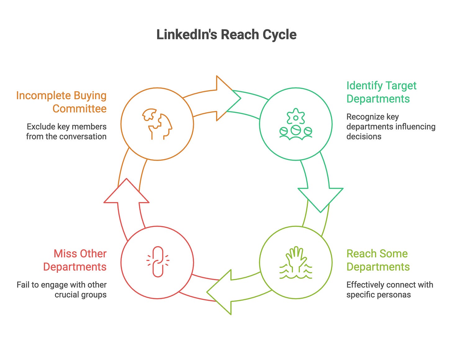LinkedIn’s own research backs this up: the platform identifies five departments that most heavily influence B2B purchase decisions — IT, Finance, Business Development, Accounting, and Operations. LinkedIn is very good at reaching one or two of them.