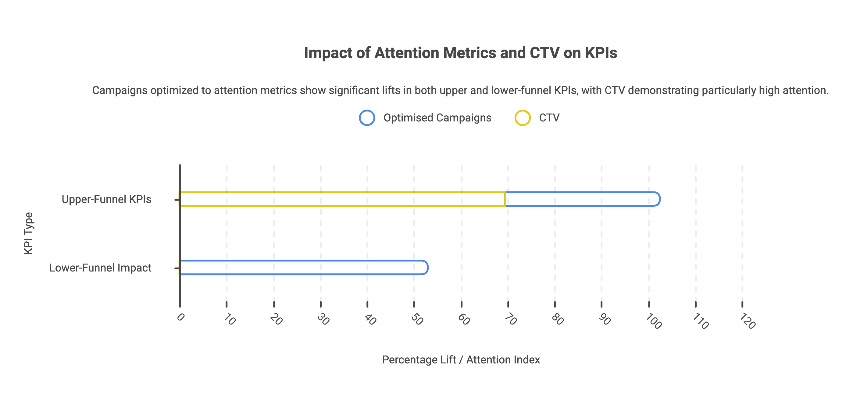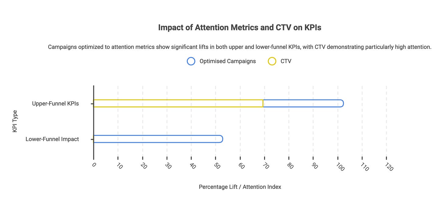 Adelaide’s 2026 Outcomes Guide, published in January, pulled together 60 case studies across 16 industries. Their headline: campaigns optimised to attention metrics saw an average 33% lift in upper-funnel KPIs and 53% increase in lower-funnel impact in 2025. That’s not a rounding error. That’s a capital-allocation argument.