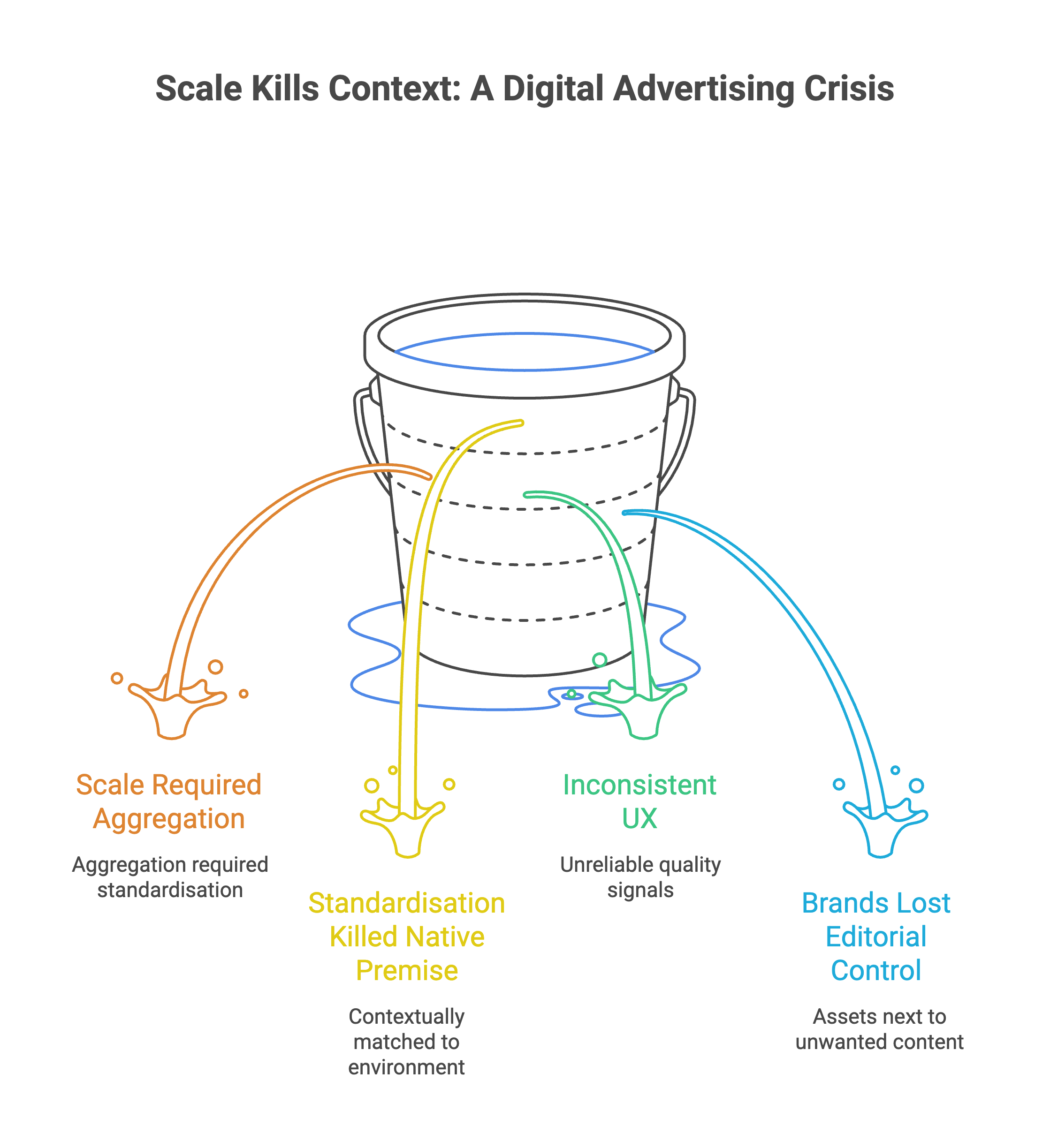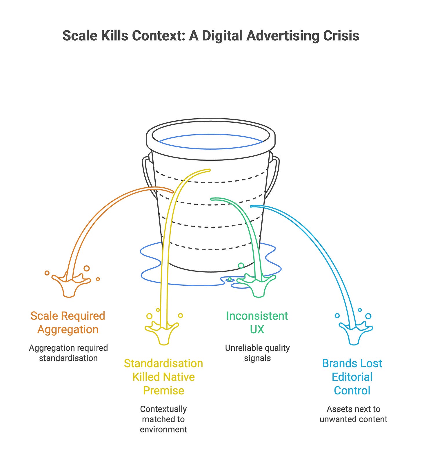Then reality arrived. Scale required aggregation. Aggregation required standardisation. Standardisation killed the native premise. You can’t be contextually matched to an environment when the same unit is running across three thousand publishers on a single insertion order. The UX became inconsistent. The quality signals became unreliable. Brands lost the editorial control they’d been promised, and found their assets sitting next to content they’d never knowingly have associated with.