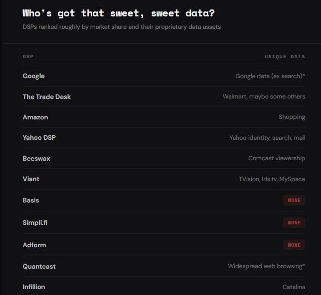Amazon DSP. Unique data asset via Amazon’s retail graph. Relevant for B2B companies selling into commerce or with distributed supply chains. Niche otherwise.